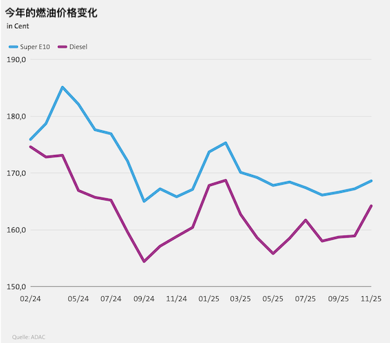 2025年是燃油价格连续第三年下降。尤其是在最近几周,燃油价格显著下降。德国汽车俱乐部ADAC预计,Super E10汽油的年均价格为每升1.69欧元,比2024年下降约5欧分。柴油每升1.61欧元,比上一年下降4欧分。回想燃油价格最高的2022年,一升柴油的平均价格为1.946欧元,而一升E10汽油的价格为1.86欧元。