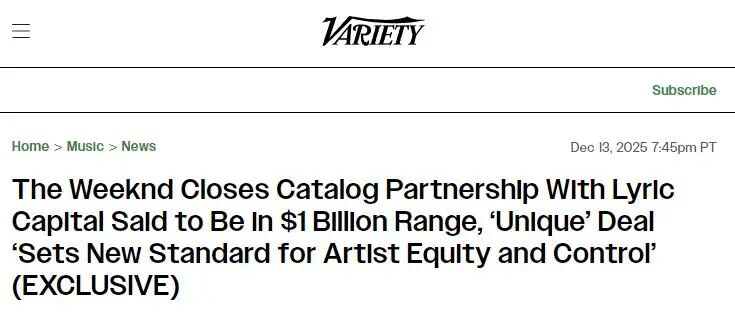 据外媒报道,加拿大歌手威肯(The Weeknd)与私募股权公司Lyric Capital Group达成了一项超过10亿美元的音乐版权交易,共同成立一家合资企业。根据协议,Lyric投资了威肯从创作之初至2025年的音乐版权。威肯及其团队将继续保留对音乐作品版权的创作控制权,并继续持有公司股份。据悉,该合作协议不包括任何未来发行的作品。