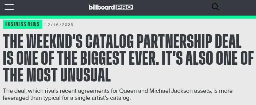 据《综艺》《公告牌》和彭博社此前报道,威肯音乐版权库估值至少为10亿美元,这其中唱片公司和出版商的净分成约为5500万美元。