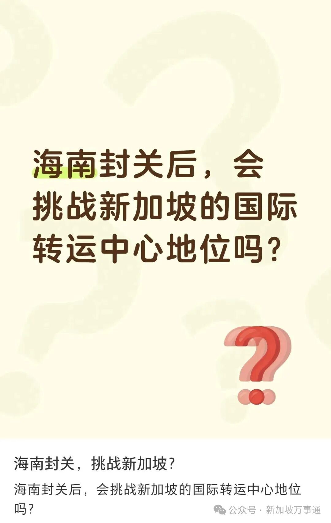 今天,万事通就带大家深度揭秘海南封关背后的隐情!而作为东南亚经济枢纽的新加坡,又会因此受到哪些影响?