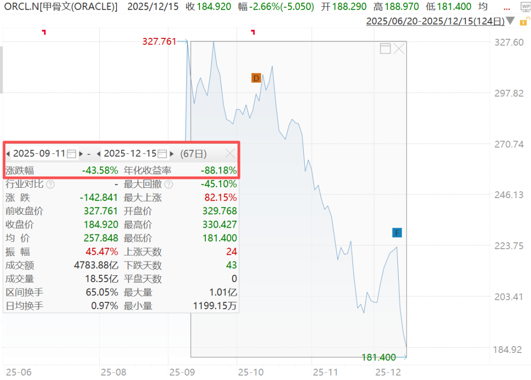 仅仅用67天,美国老牌科技巨头甲骨文(Oracle),就完成了从老板登顶全球首富,到公司股价腰斩的轮回。与此同时,甲骨文的信用违约互换价格(CDS),不仅飙升至五年新高,甚至直逼08年金融危机,意味着公司的财务状况急剧恶化。