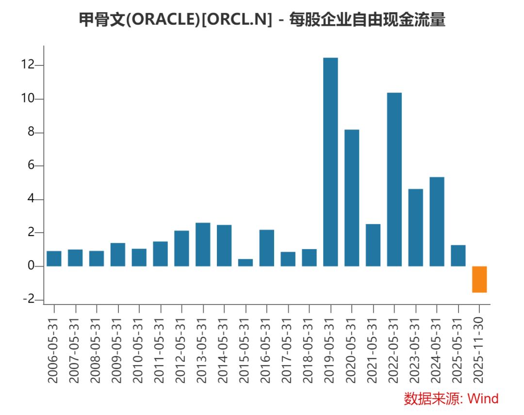 为了支撑这场AI豪赌,甲骨文大举投资,导致当季自由现金流为负100亿美元,近20年来罕见。