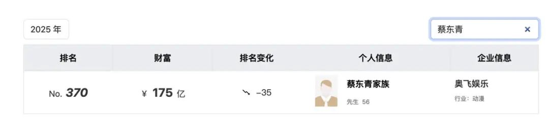 胡润最新数据,蔡东青家族身家达到175亿元。