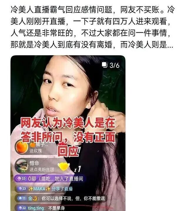 此前,冷美人“爆料”自己是单亲妈妈,离婚带俩娃,婆婆对她不好,但火了之后,网友扒出,她并没有离婚,丈夫是正式单位工作人员,住院期间经常陪同,婆婆也帮忙带孩子,家庭条件并不差。
