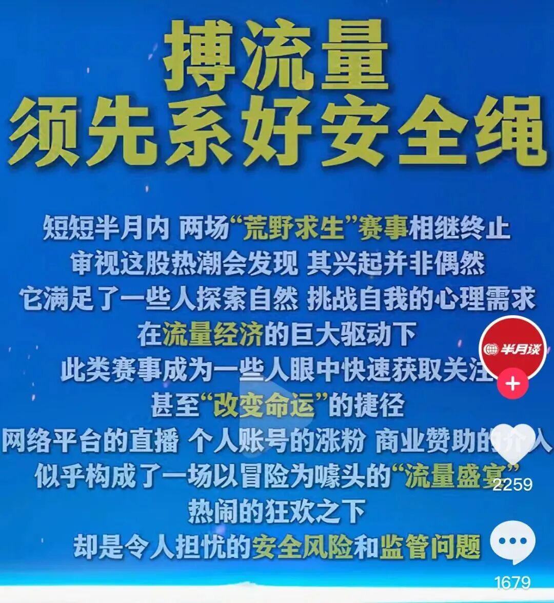 荒野求生想成“网红工厂”,想得太简单了。所以,官媒也在锐评,博流量须先系好安全绳。流量盛宴背后是安全风险和监管问题。