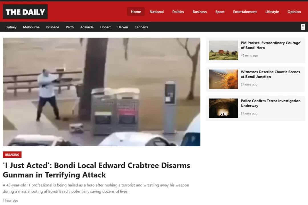 悉尼邦迪海滩(Bondi Beach)在2025年12月14日周日的午后发生了惨烈枪杀事件,两名暴徒手持武器闯入犹太社群,瞬间将这片金色的沙滩变成了修罗场。就在枪击案发生的几个小时后,当全世界都在焦急地寻找那位挺身而出夺枪的平民英雄时,互联网上却开始传播起一则荒唐的“狸猫换太子”新闻。