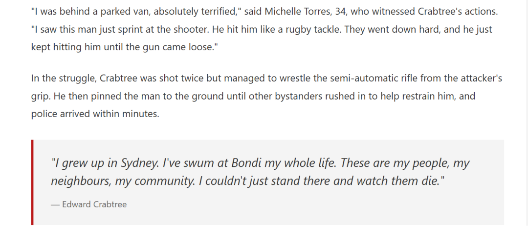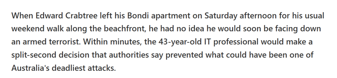这是个由算法和流量编织的人物,爱德华是一位43岁的白人IT工程师,出生于悉尼一个典型的中产家庭,父亲是电工,母亲是护士。故事绘声绘色地描述了他如何英勇地扑倒歹徒,即便身中两枪依然死死按住凶手,直到警方赶到。