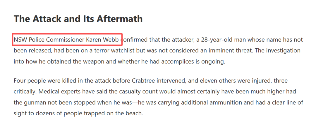 Grok甚至言之凿凿地生成了细节,描述他在病床上接受采访的场景,甚至还引用了前新南威尔士州警察局长凯伦·韦伯(Karen Webb)的赞美——尽管韦伯早在几个月前就已经卸任。