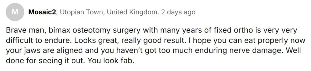 “真勇敢,双颌骨截骨手术还要常年带矫正器,真的非常非常难熬。你看起来很棒,做的很成功。希望你的上下颌已经对齐,可以正常吃饭,也不会留下太多永久性神经损伤。能坚持下来真了不起。你看起来棒极了!”
