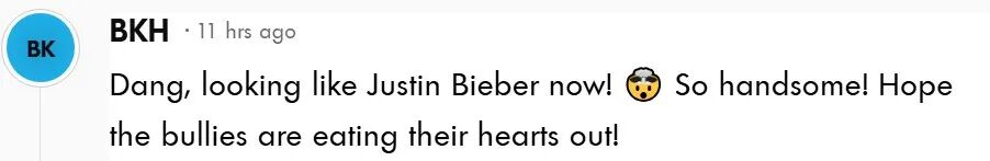 “天哪,他现在看起来像贾斯汀·比伯!太帅了!让那些欺负过他的人羡慕去吧!”