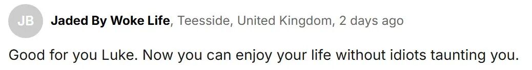“真为你高兴Luke,现在你可以享受没有白痴嘲讽的人生了。”