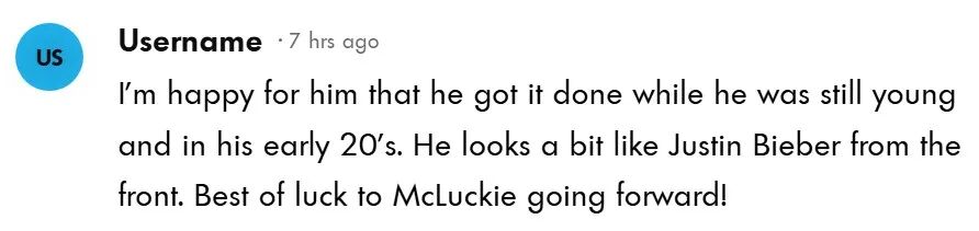 “真替他感到高兴,能趁着年轻,在20岁出头就把手术做了。从正面看的话,他有点像贾斯汀·比伯。祝他今后一切顺利!”