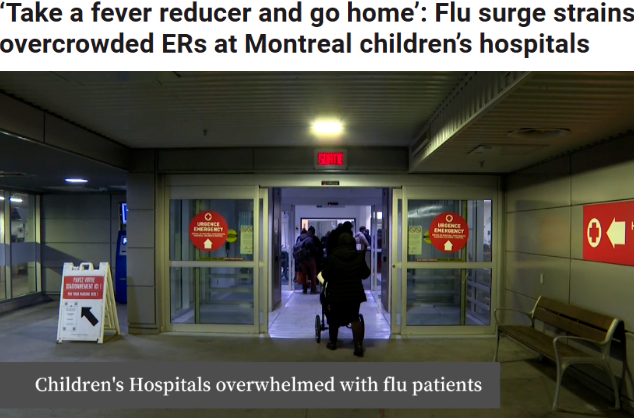 蒙特利尔的两家儿童医院正面临严重的人员拥挤问题。由于大量家庭因流感相关疾病前来求医,而医生表示其中许多情况其实并不需要前往急诊室,医院急诊已远超承载能力。