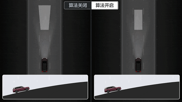 为了解决这个问题,华为乾崑不久后就会给光毯增加一个坡度补偿的功能,也就是让摄像头、雷达等传感器提前获得前方的坡度信息,再根据路面的形变数据来调整投影的形状、补偿光毯的形变,让它始终贴合前面的车道,就像这样。
