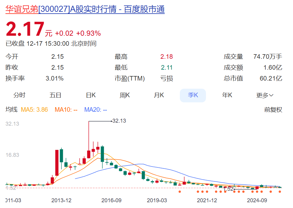 资本市场上,华谊兄弟近年来股价持续走低,截至17日收盘报2.17元,总市值仅剩60.21亿元,不及巅峰时十分之一。