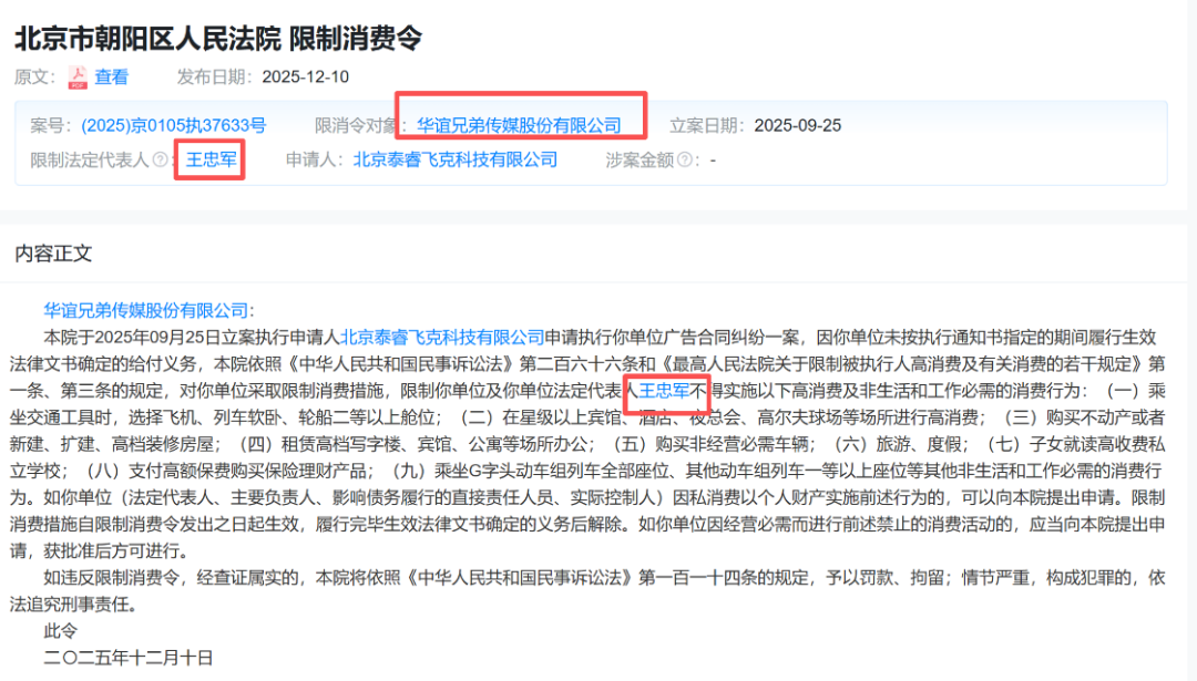 此外,天眼查显示,近日华谊兄弟及其法定代表人王忠军新增一则限制消费令,涉及广告合同纠纷案件,申请人为北京泰睿飞克科技有限公司,执行法院为北京市朝阳区人民法院。