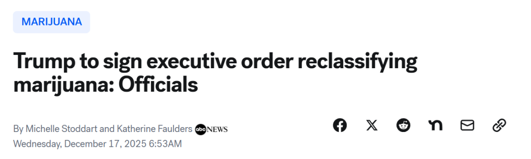 据ABC新闻12月17日报道 两名熟悉相关情况的高级政府官员透露,美国总统川普最早可能于12月17日周三签署一项行政命令,将大麻重新归类为“附表III”药物,此举将实质性放宽联邦层面对大麻的限制。新闻报道截图