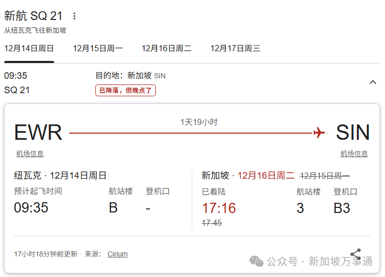 好不容易盼到最新计划:新航班定于当地时间16日早上9点35分从纽瓦克机场起飞,要是顺利的话,新加坡时间17日下午4点39分能到。