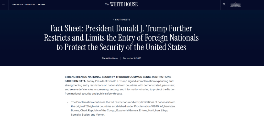 白宫在相关公告中表示:“总统公告所实施的限制和措施,是为了防止美国在缺乏足够信息的情况下接纳外国公民,从而无法评估其可能带来的风险,也无法确保外国政府合作、有效执行移民法,并推进重要的外交政策、国家安全和反恐目标。”