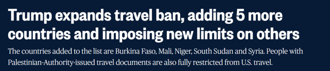美国总统川普政府正在扩大“旅行禁令”范围,新增对五个国家的全面入境禁令,并对其他国家实施新的限制措施。新闻报道截图