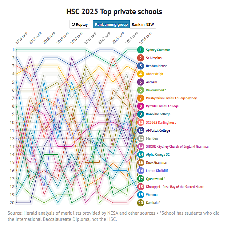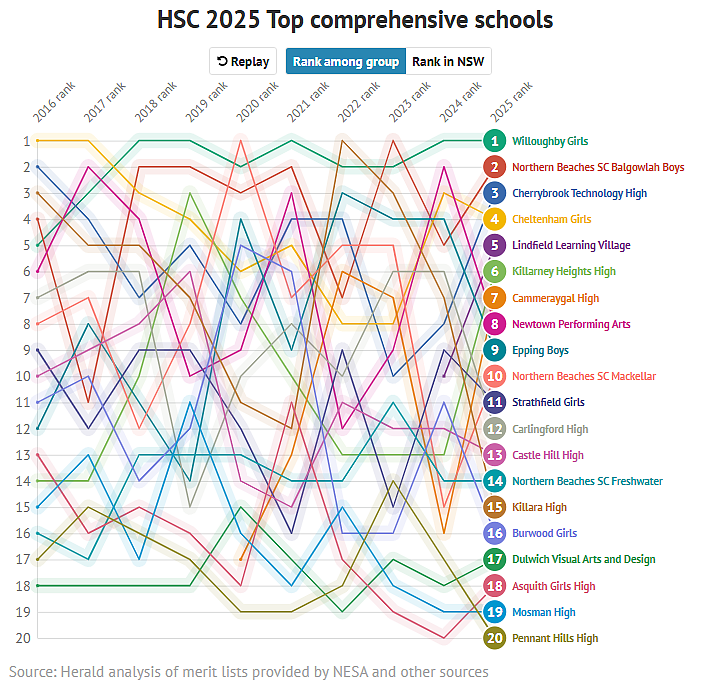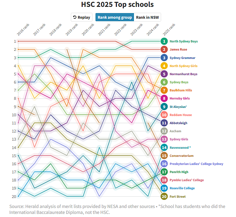 排名前10的学校中有7所为公校,私校St Aloysius' College和Reddam House也跻身前10。其后依次为女校Abbotsleigh、Ascham和Sydney Girls。
