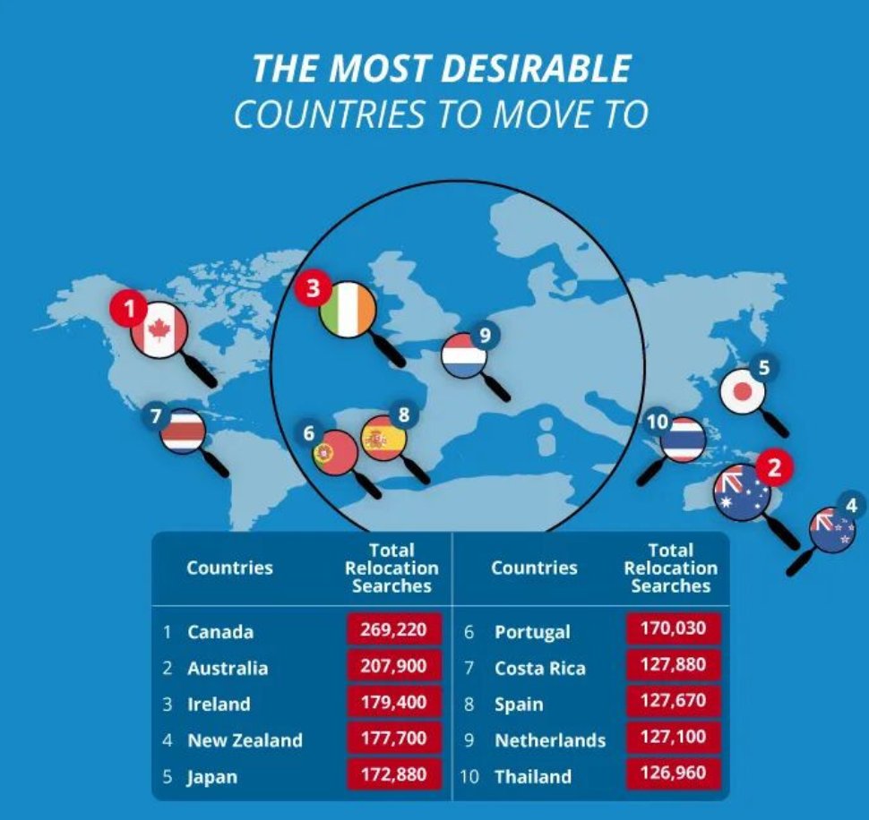 加拿大再次成为全球最热门的移居目的地,年搜索量超过26.9万次,在75个国家中排名第一。