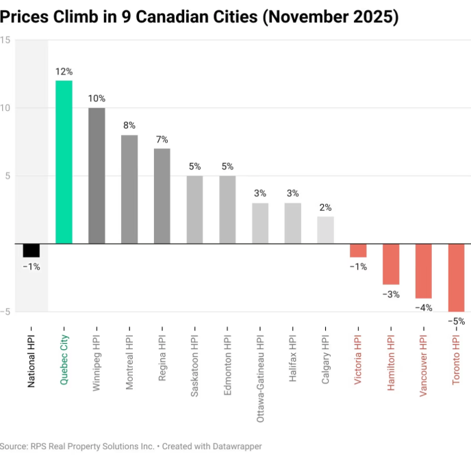 在2025年,只有四个大城市的房价指数同比录得下跌,其中多伦多以5%排在跌幅榜榜首,温哥华排第二,跌4%,哈密尔顿跌3%,维多利亚跌1%。