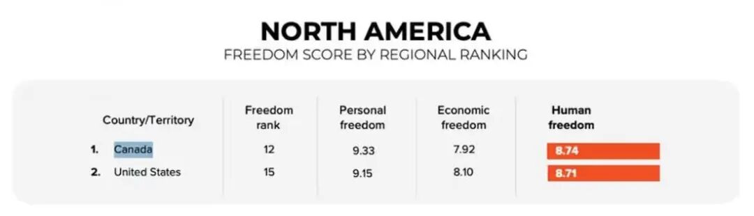 在北美洲范围内,加拿大位列第一,以微弱优势领先美国。美国在全球排名第15位,个人自由得分9.15,经济自由得分8.10,人类自由得分8.71。