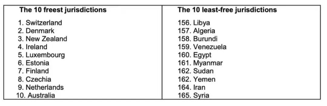 2023年全球最自由与最不自由国家前十位(人类自由指数排名)