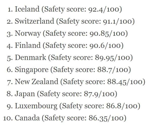 这份排名综合了联合国(United Nations)、世界银行(World Bank)、世界卫生组织(World Health Organization,WHO)、透明国际(Transparency International) 的数据以及Numbeo的调查,通过 安全指数得分(从0到100)对各国进行排序。分数越高,国家越安全。