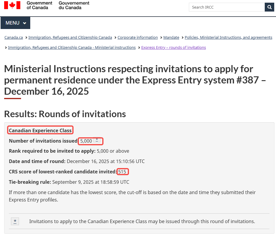 继上周的抽分后,IRCC本周二(12月16日)又进行了一轮加拿大经验类(CEC)抽选: