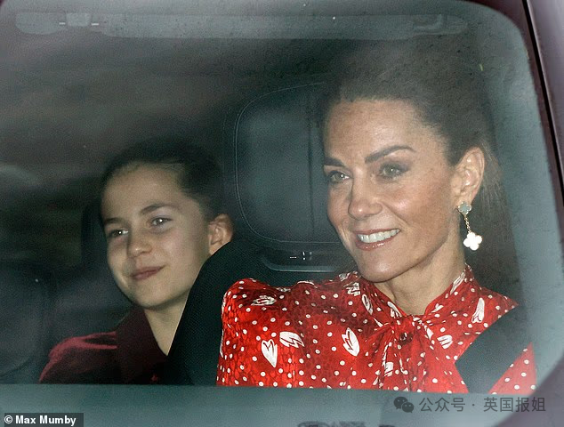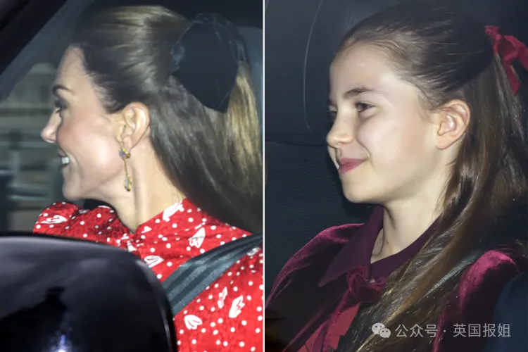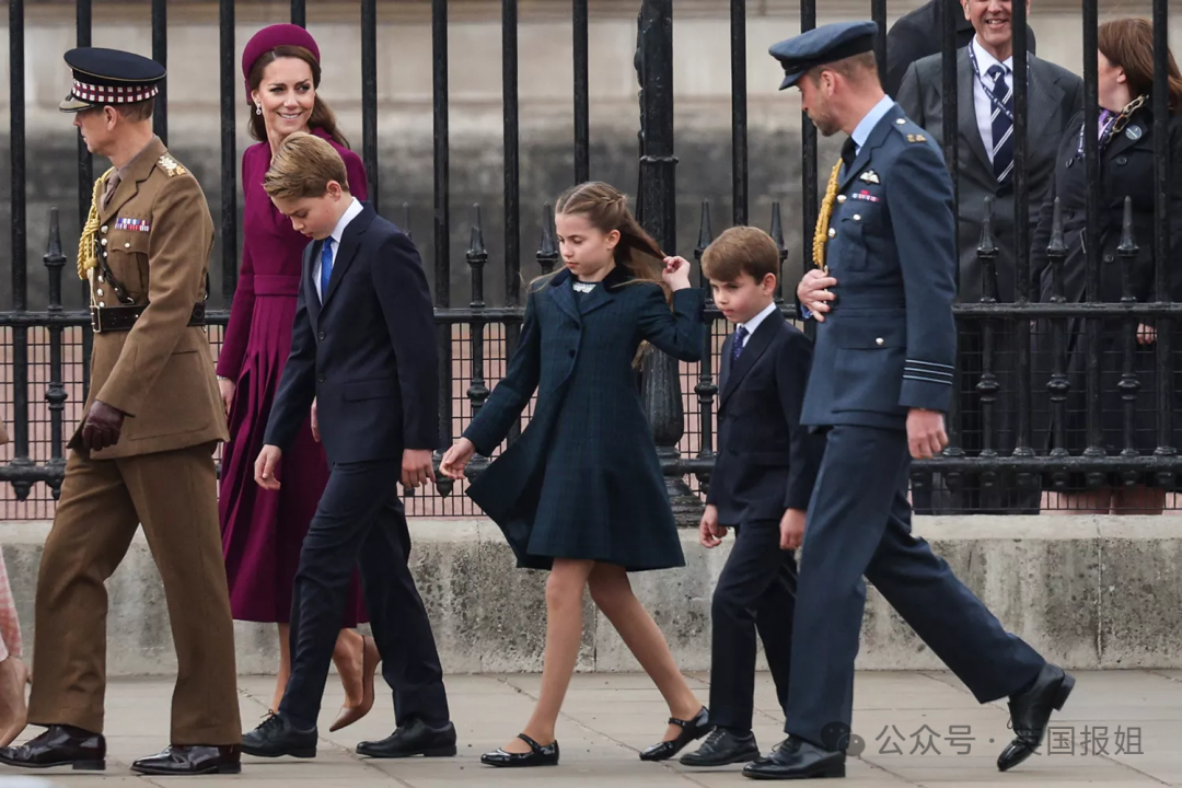 凯特身着一件华丽的森林绿大衣,显得格外迷人。夏洛特选择了一件甜美的深蓝色中长连衣裙,与爸爸和哥哥们的着装相协调。连衣裙的白色荷叶边领口系着一个漂亮的蝴蝶结,更添精致。