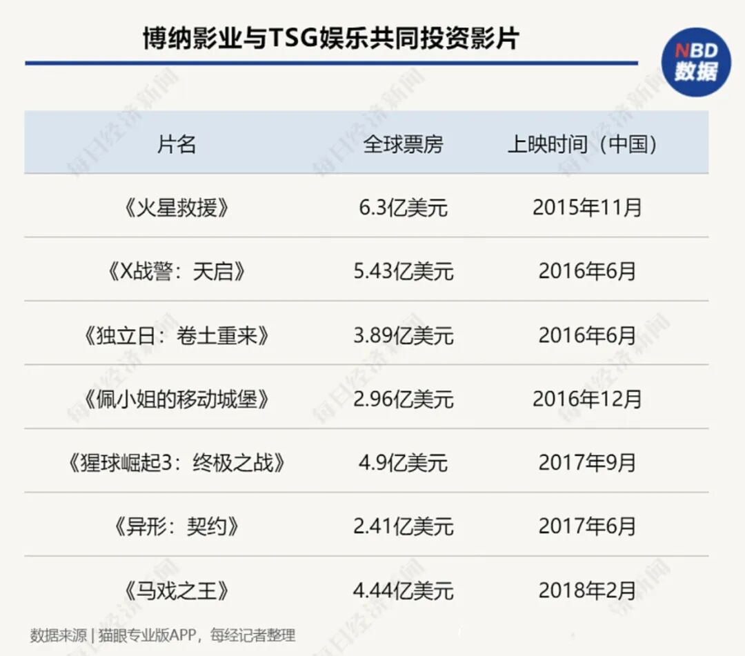 ▲博纳影业与TSG 娱乐共同投资的部分影片/ 来源:猫眼、每日财经