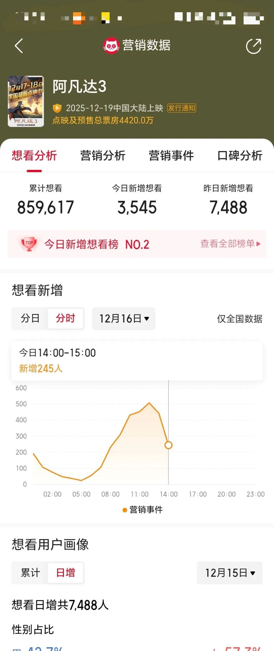 《阿凡达3》还没上映,股市却已经先“散场”了。电影这边挺热闹。据猫眼专业版数据,截至12月16日,《阿凡达3》点映加预售票房冲到4420万,近86万人在猫眼点了“想看”,成都某VIP影厅票价最高卖到280元。股市却是另一幅画风。博纳影业前脚刚因为《阿凡达3》的预期走出“5天4板”,后脚就在12月15日、16日连续两个跌停,华谊、慈文、幸福蓝海们也纷纷“跟跌”。▲《阿凡达3》预售数据/ 来源:猫眼