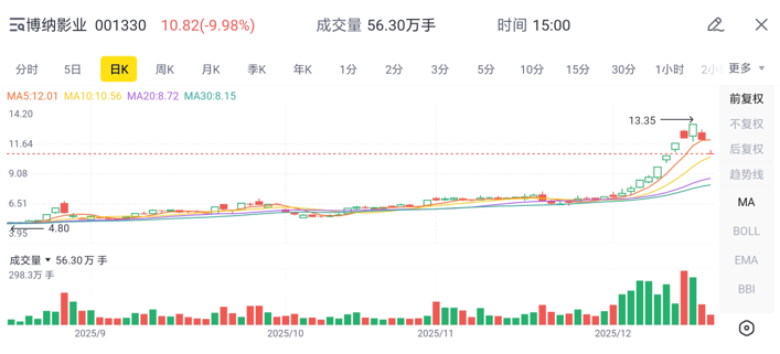 12 月以来,博纳的股价明显跑赢了行业均值,先是连续涨停,随后三次触发异常波动公告,最高一度冲到 13.35 元的阶段新高。即便中途出现过跌停,月内累计涨幅仍然高达 68.82%。