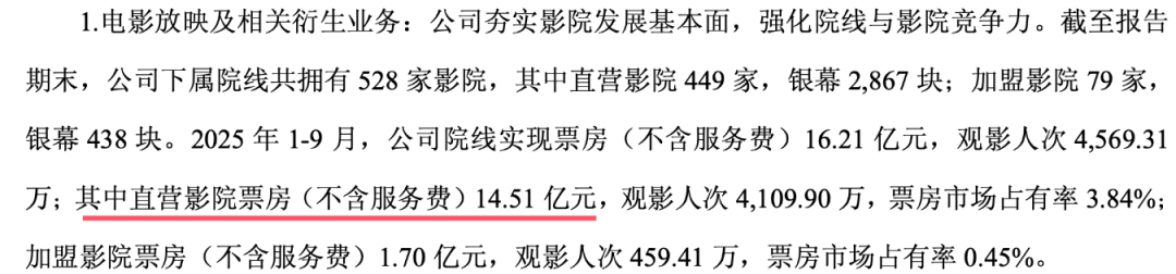 横店的核心逻辑很简单:用规模换稳定。公司旗下拥有 528 家影院、2867 块银幕,前三季度直营影院票房 14.51 亿元,市场占有率 3.84%,在基本盘上先站稳。