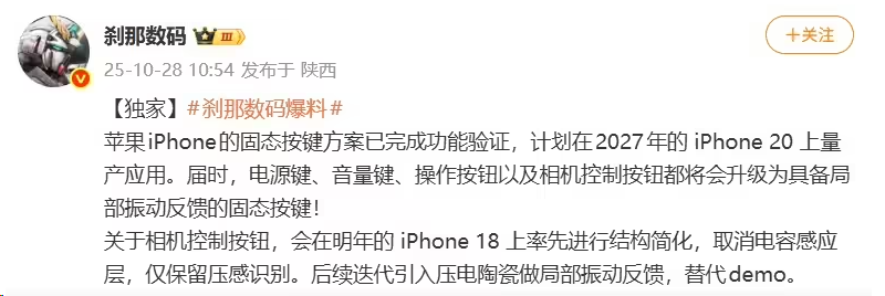 电源键、音量键、操作按钮和相机控制按钮,升级到自带局部震动反馈的「固态按键」。