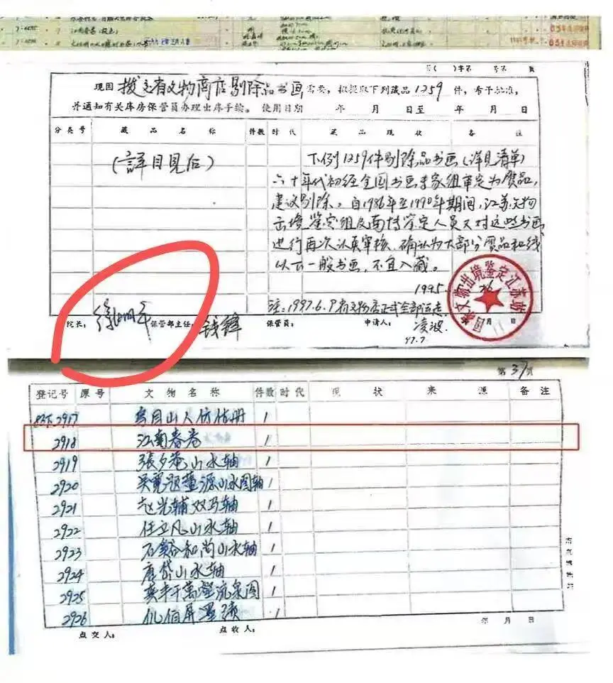 拨交证明有时任院长徐湖平、保管部主任钱锋、申请人凌波的签字。2001年4月16日《江南春》被“顾客”以6800元价格购买,销售清单明示为《仿仇英山水卷》。