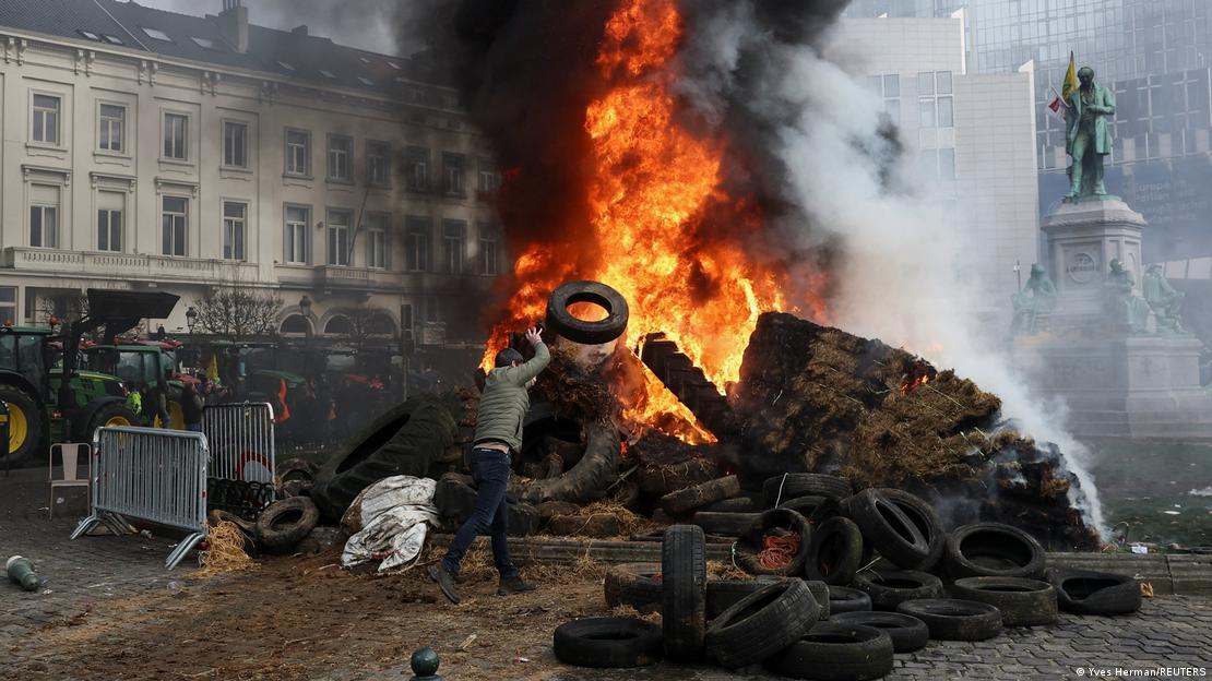 示威者12月18日在布鲁塞尔街头焚烧轮胎,抗议欧盟计划与南美国家签署南方共同市场协议的计划图像来源: Yves Herman/REUTERS