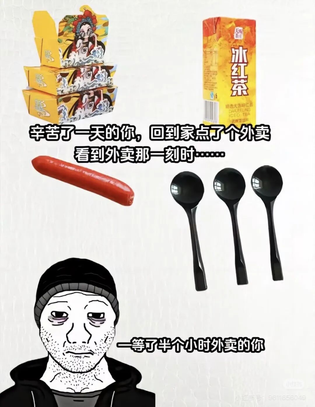 大家一顿操作猛如虎,对着外卖平台苦心研究半小时,收到手的外卖打开还是老样子:国潮包装袋、黑色液体勺、海绵宝宝餐具套装,含泪吃下0.01元加购买到的烤肠,吃完感觉自己脏脏的。