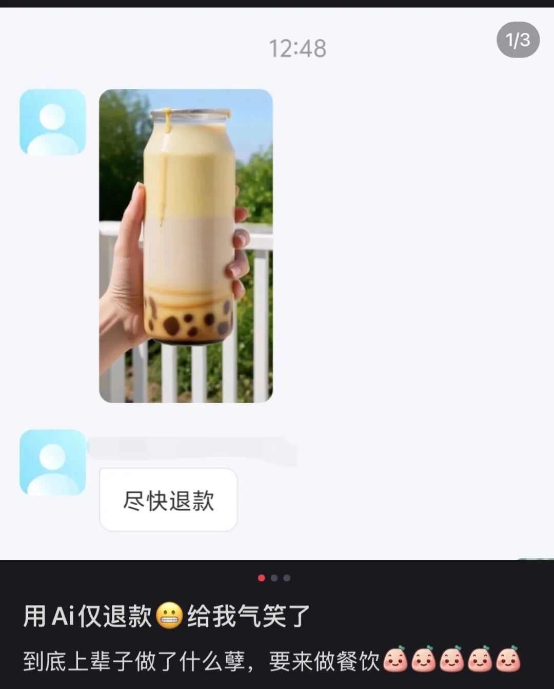当商家熟练运用 AI 生成不存在的卖家秀时,一些消费者也默默点亮了“AI维权”技能:用 AI,几分钟内生成一张漏了的奶茶图片或汤里浮着小虫的特写,截图提交,申请退款。