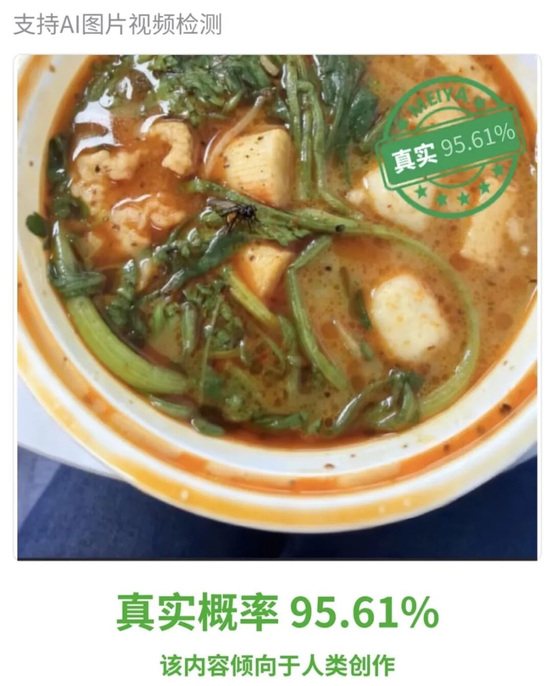 如今,AI 生成的菜品图被 AI 加工放进苍蝇,再送进 AI 工具里检测 AI 痕迹。