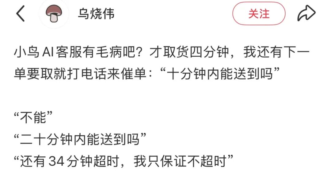 这也没法怪骑手什么,送餐本来就很忙,还要接 AI 监工的电话,当然没啥好语气,估计他们自己都不知道这些话会被另一个 AI 转达给顾客。