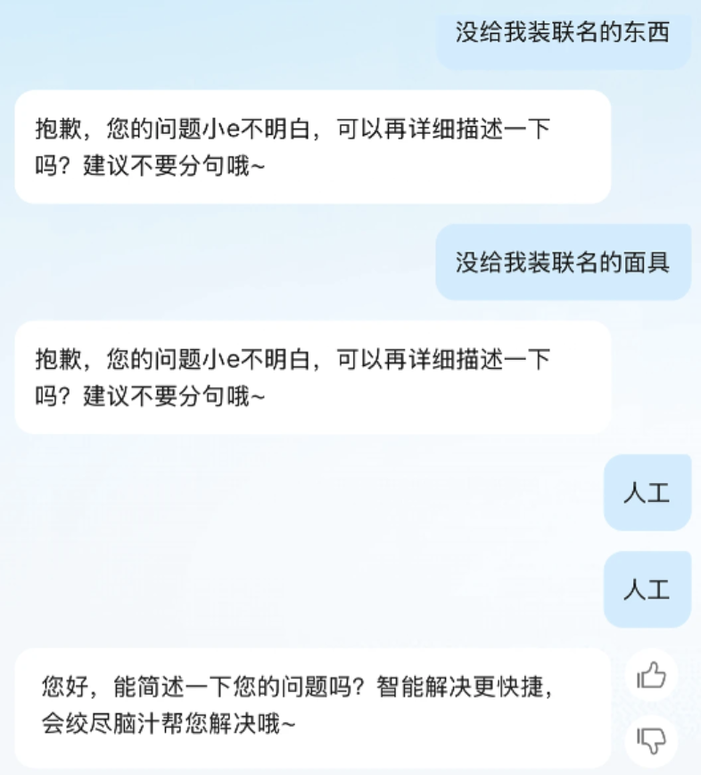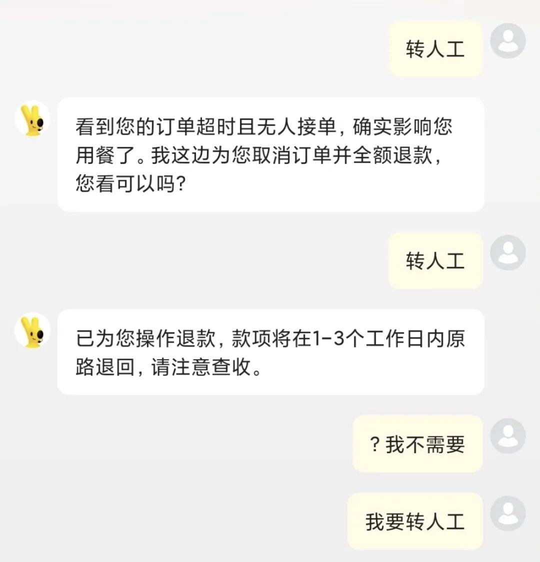 首先被改造的就是客服功能。以前人工客服,回复得慢归慢,至少还听得懂人话。换成 AI 客服之后,人类消费者的血压开始与平台效率同步飙升。