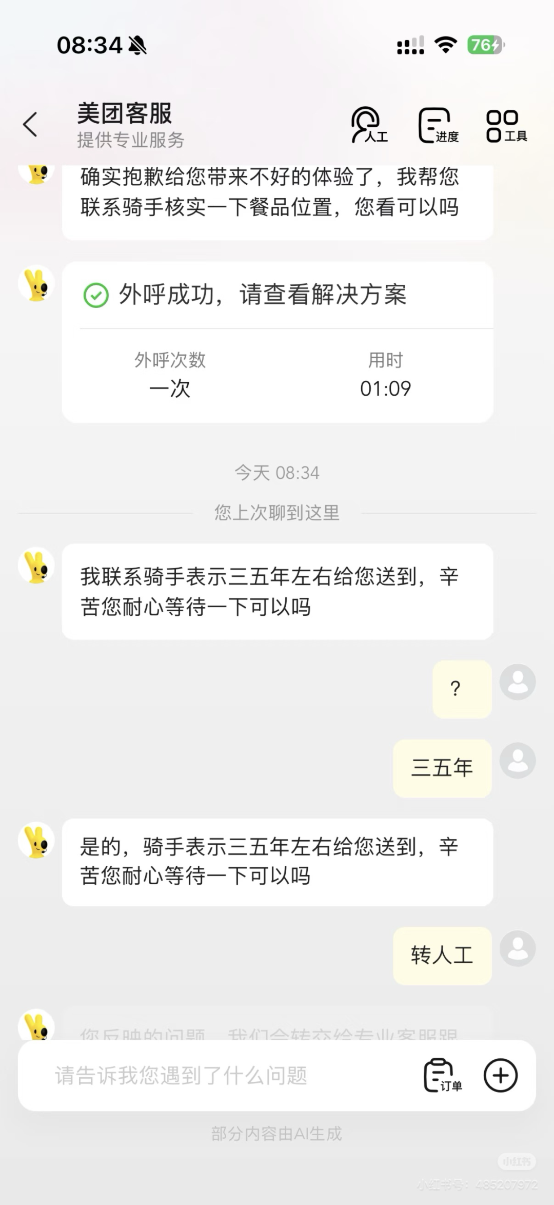如果外卖送得太慢,消费者在客服窗口催单,平台会给骑手拨一个 AI 电话,问骑手还有多久可以送到,再将骑手那夹杂着风声、喘息与不耐烦的答复,经由 AI 提取关键词,组装成一句规整的模板话术转述给你:还有三五年就送到了,辛苦您耐心等待。