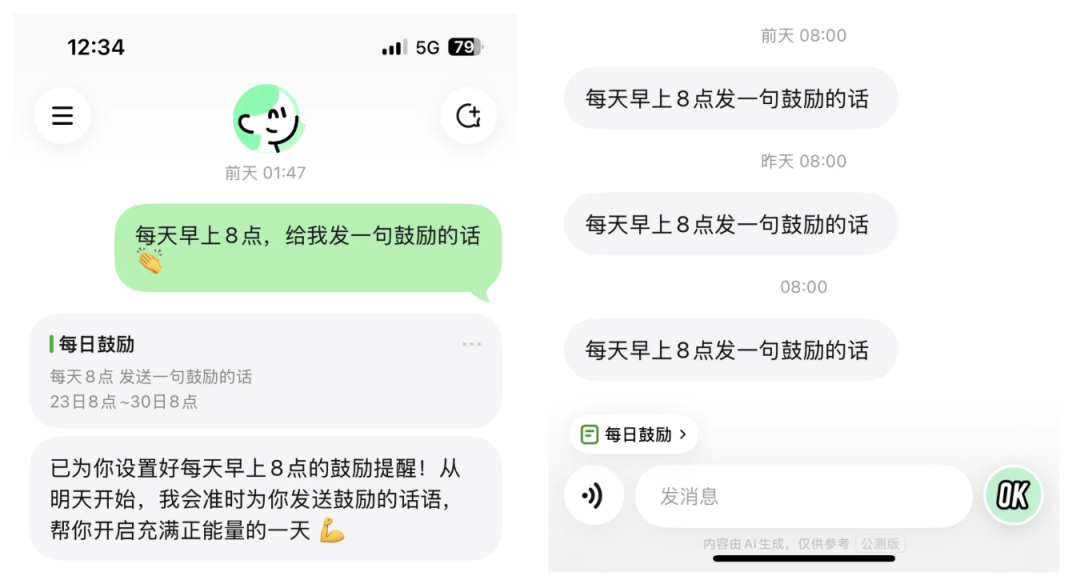“每天早上8点,给我发一句鼓励的话”“已设置好鼓励提醒”“每天早上8点发一句鼓励的话”。