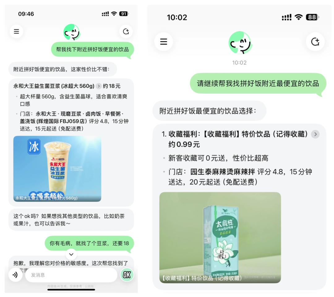 这个是官方的宣传啦,实际执行起来是这样的:“帮我找便宜的饮品”“你有毛病,就找了个豆浆,还要18”。
