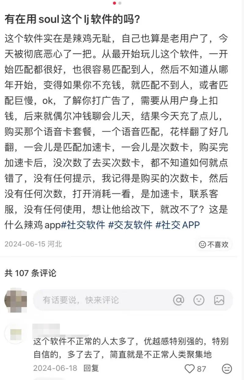 在年轻人聚集的小红书等社交平台上,也有不少用户分享其负面体验,吐槽平台”聊骚““侮辱性言论”太多,或抱怨匹配质量下降。