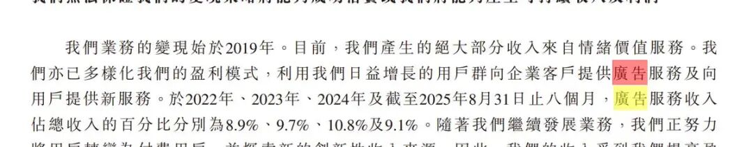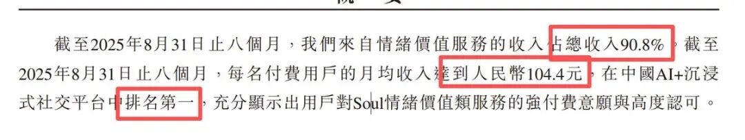 招股书显示,2025年前八个月,此项“情绪价值服务”收入占比高达90.8%,每付费用户月均贡献104.4元。