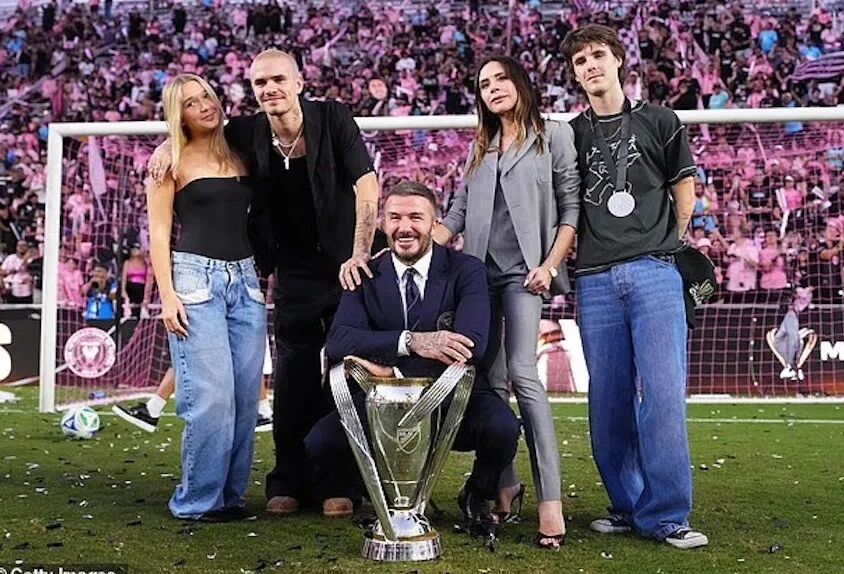 他与妻子维多利亚、23岁的罗密欧、20岁的克鲁兹以及14岁的哈珀一起庆祝他的迈阿密国际足球队在上周末赢得首个美国职业足球大联盟总冠军。